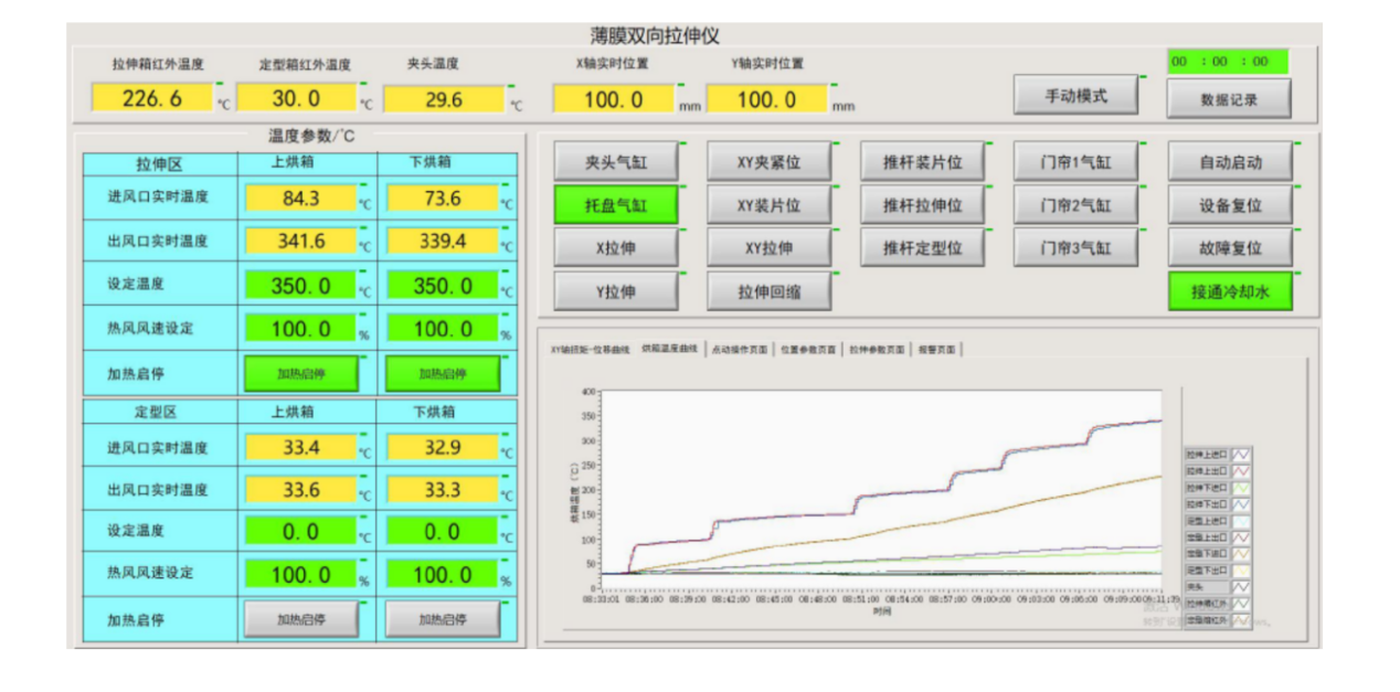 觸摸屏操作界面,可預(yù)設(shè)拉伸程序(溫度、速度、拉伸比等參數(shù))。